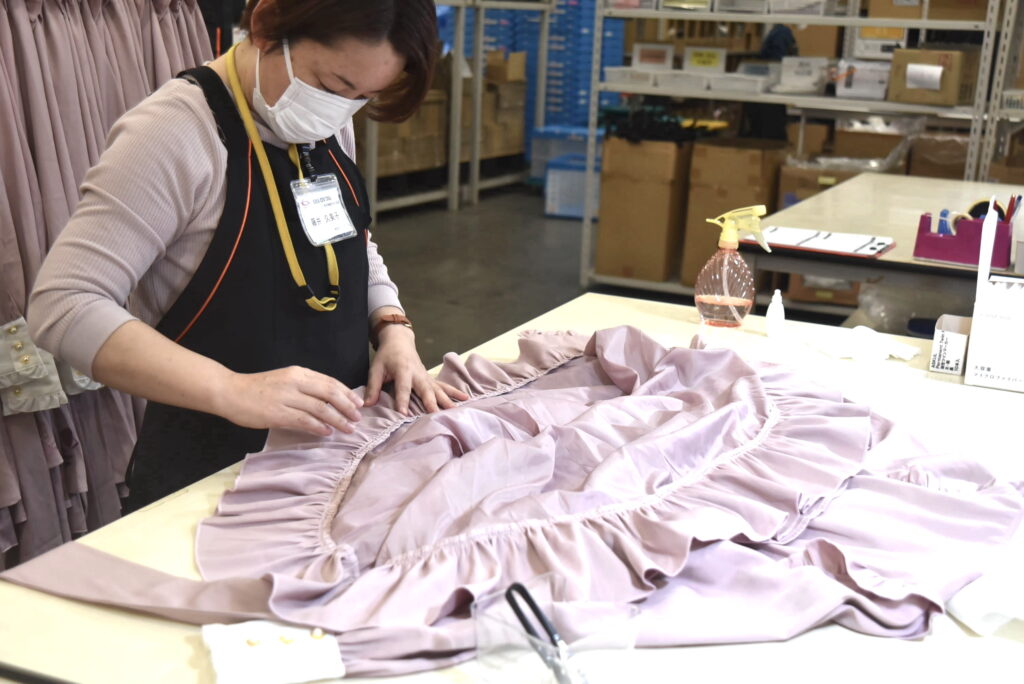 お邪魔した時は、ちょうど子ども用ワンピースを検品している真っ最中。 縫い目のほつれや糸切れ、縮みがないか、ボタン付けの強度はあるか、刺繍の縫いズレはないか、など。目視や手で触りながら1着ずつチェックしていきます。