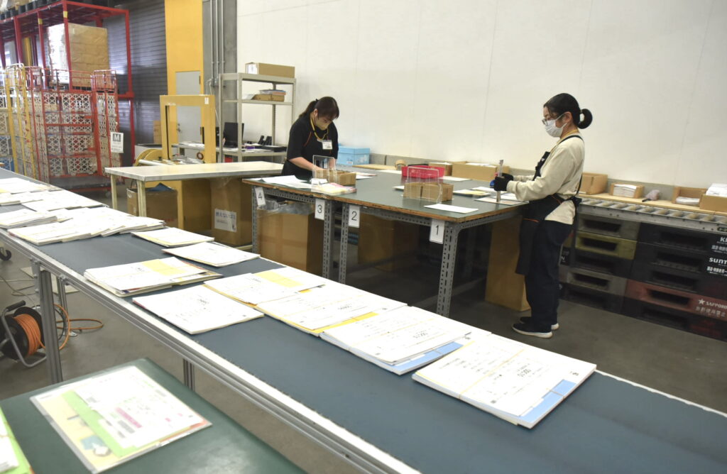 複数の教材や書類、案内チラシなどを仕分け、箱詰め、封止、宛名貼りまで、すべて手作業です。アナログ的ではありますが、個人情報を取り扱うため紛失や混入、取り違えなどのミスを防ぐよう厳重な管理のもと、目視で細心の注意を払っているそうです。