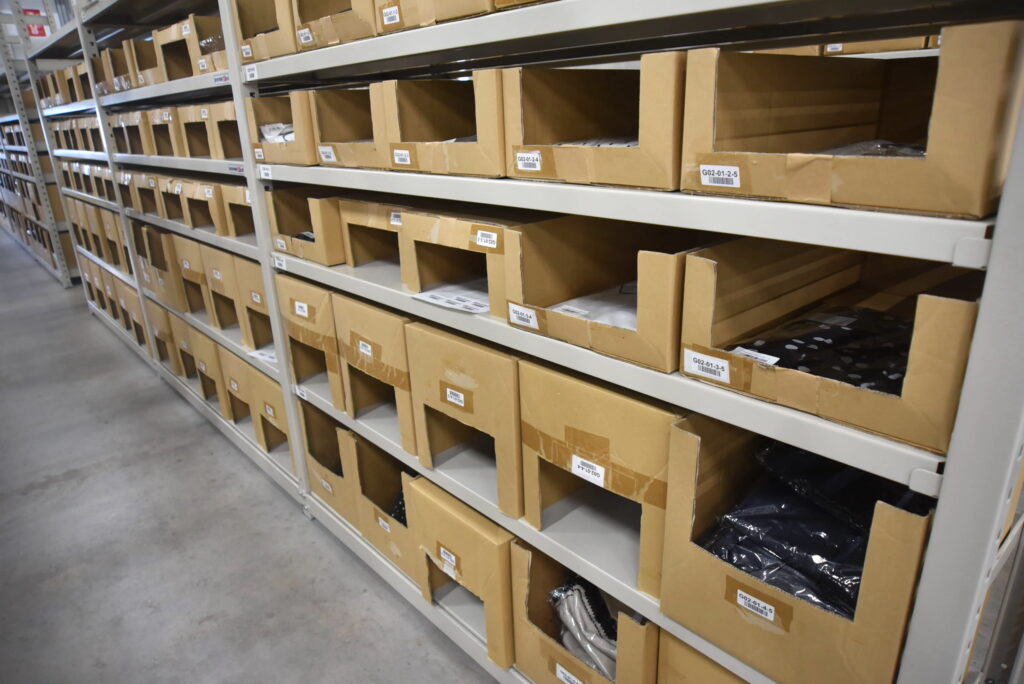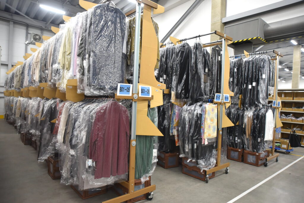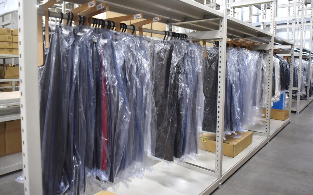 アパレルでは、ハンガー掛けのスーツやジャケット、ワンピースなども、たたまれたシャツやブラウスなども、すべて住所のように番号で管理され、何がどこにあるか一目瞭然です。