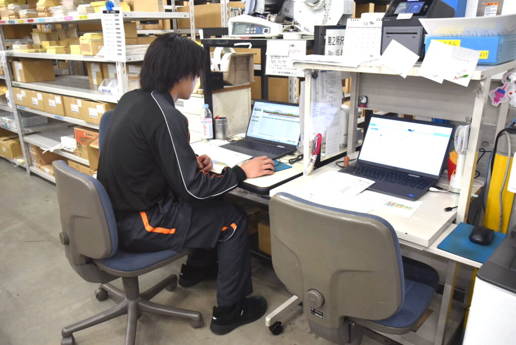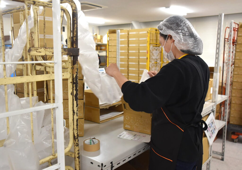 棚に置かれた段ボールは、商品が取り出しやすいよう手前に切り込みを入れ、商品が空になったら伏せておくなど、細かな工夫がいっぱい。現場スタッフたちが効率的に働けるようアイデアを出し合っているそうです。